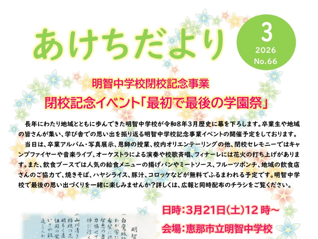 あけちだより3月号「第53回光秀まつり明智光秀役・騎馬武将役募集」のお知らせ「第37回日本大正村おひなまつり」開催のお知らせ2月3月の大正村情報あけちだより2月号1月2月の明知鉄道情報第3次明智地域計画あけちだより1月号 -過去の新着情報を表示- 行こまい 乗ろまい 歩こまい 知ろまい 食べよまい 買おまい 泊まろまい 空き家情報 子育て支援情報 ふるさと納税 明智地域自治区運営協議会だより 地域カレンダー
